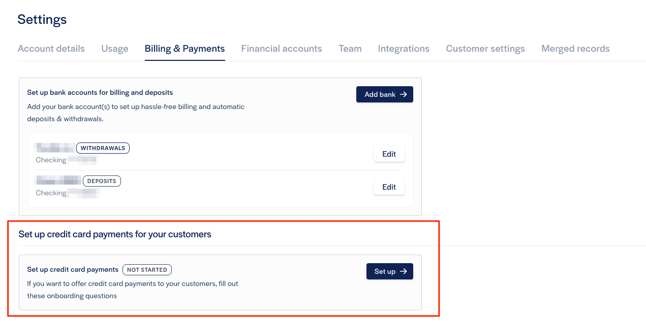 Step 1: Log in to your Resolve merchant dashboard. Navigate to the Settings page —> Billing & Payments tab. You'll see a prompt to set up credit card processing.