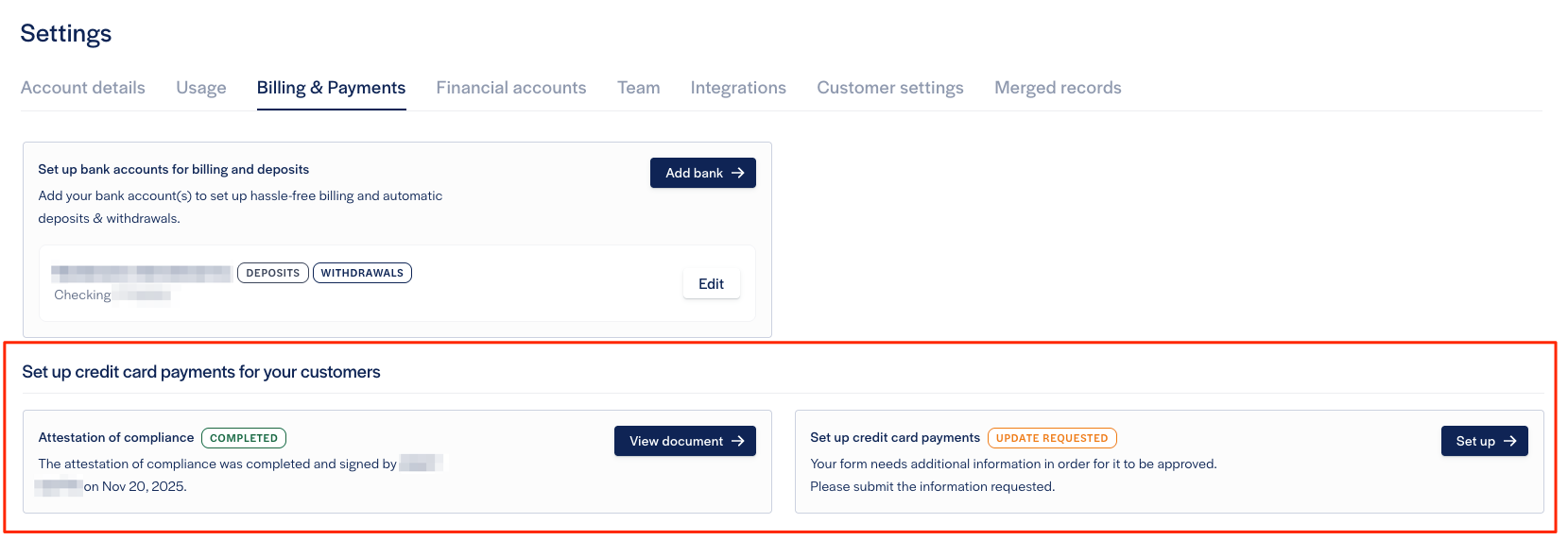 Step 5: You'll receive an email confirmation once your application is approved. This typically takes 1–3 business days. You may receive an email requesting additional information. When this happens, you will also see the request reflected in the Billing & Payments tab.